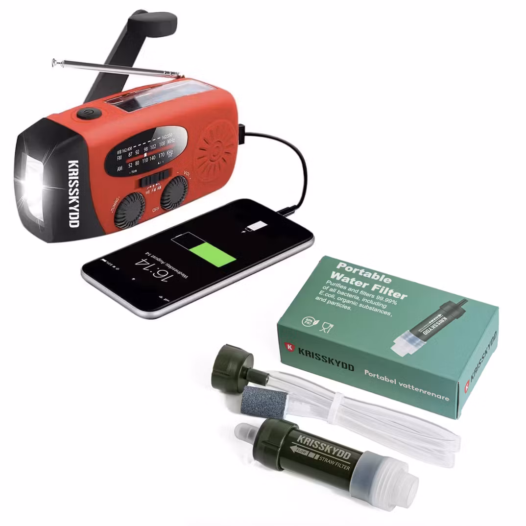 Tämä valmis aloituspaketti kattaa kaksi kriisitilanteen tärkeintä perustarvetta: puhtaan juomaveden ja luotettavan tiedonsaannin. Saat vedenpuhdistimen ja veivattavan hätäradion kätevästi yhdessä paketissa – edullisemmin kuin erikseen ostettuna.