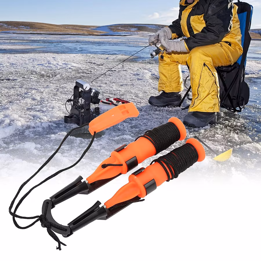 Jäänaskalit liukumattomilla kahvoilla ja pillillä. Apuväline omatoimiseen pelastautumiseen jäätapaturmassa. Kannetaan kaulassa.