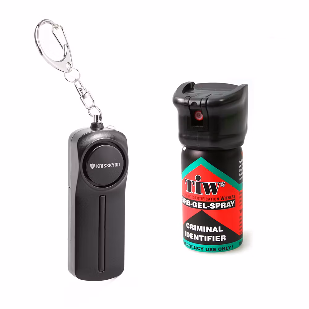 Personligt skydd med överfallslarm och laglig försvarsspray. Två kompletterande skydd i ett paket. Tillverkad i Sverige. Prisvärt val för vardagstrygghet.