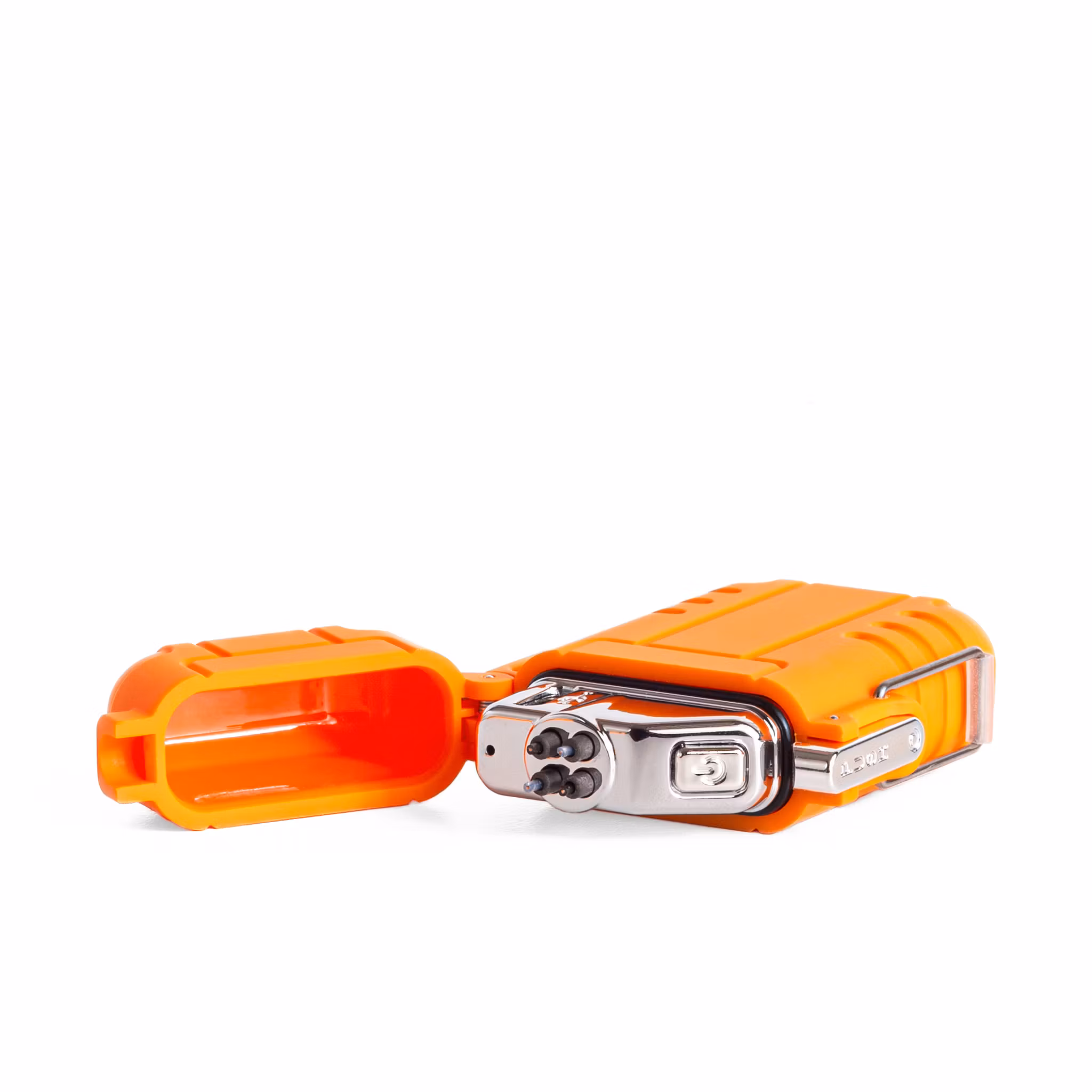 Oranssi sytytin, joka sytyttää erittäin kuumalla sähkökaarella tulen sijaan. Sisäänrakennettu akku ladataan USB:n kautta, joten sytytin ei koskaan lopu.